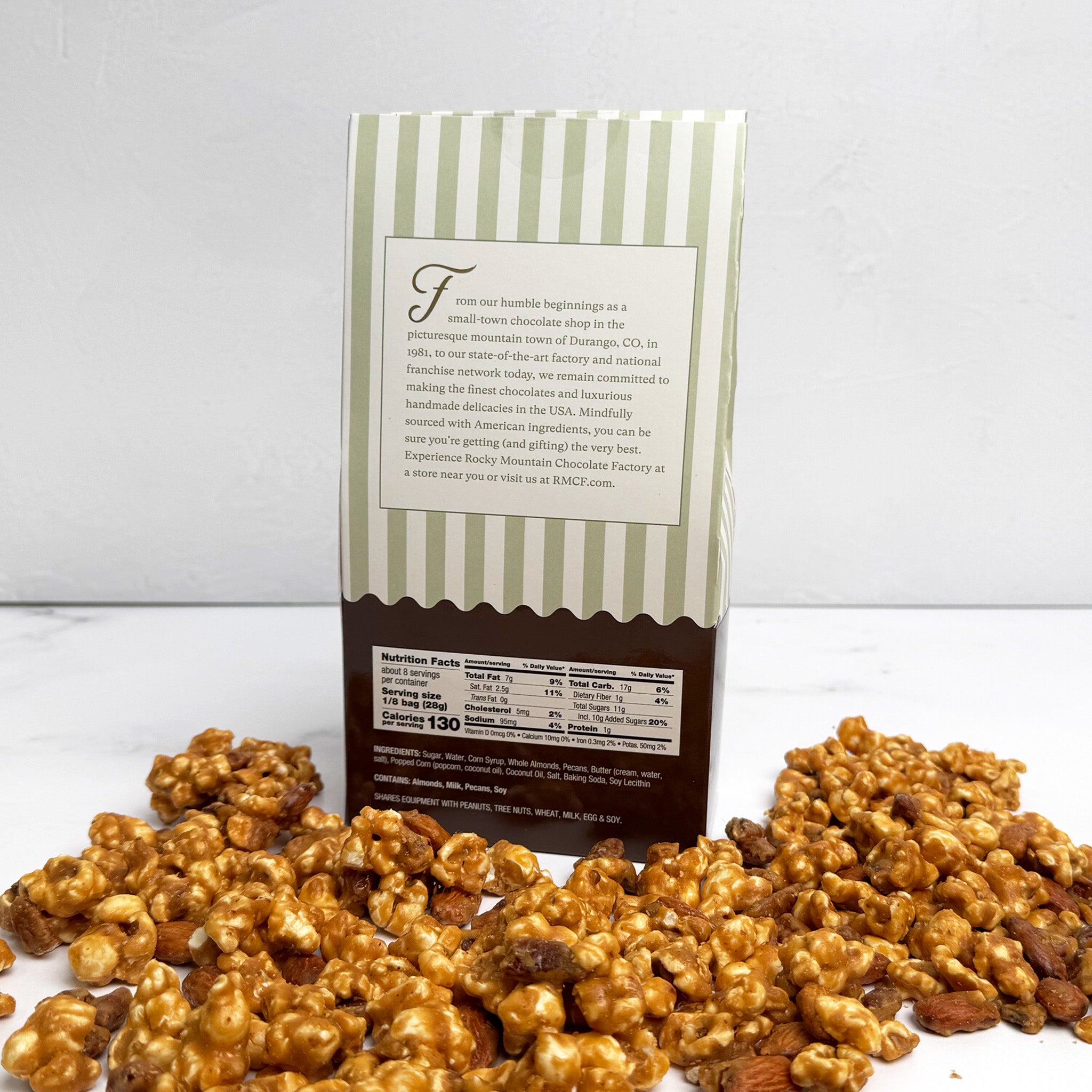 We start with freshly popped, airy popcorn, coat it in a luscious layer of rich, buttery caramel, and finish with a generous sprinkling of freshly roasted pecans and almonds. The result? A decadent blend of crunch, sweetness, and nutty perfection that turns every bite into a luxurious experience.